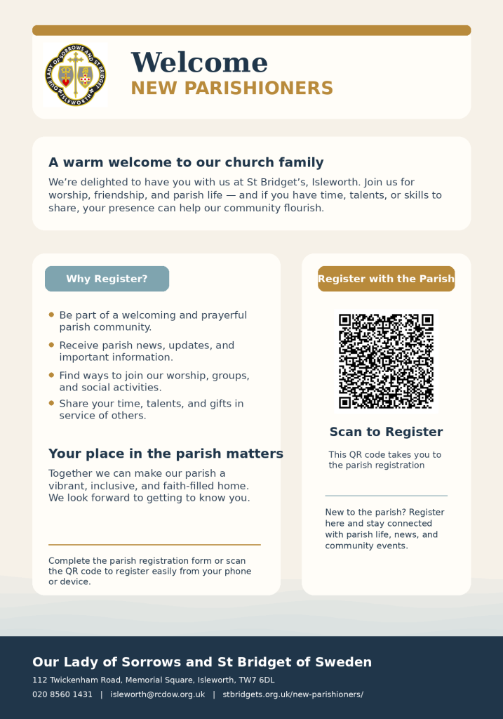 Kindly complete this parish registration form or you can scan the QR code on this page to register easily from your phone or device.